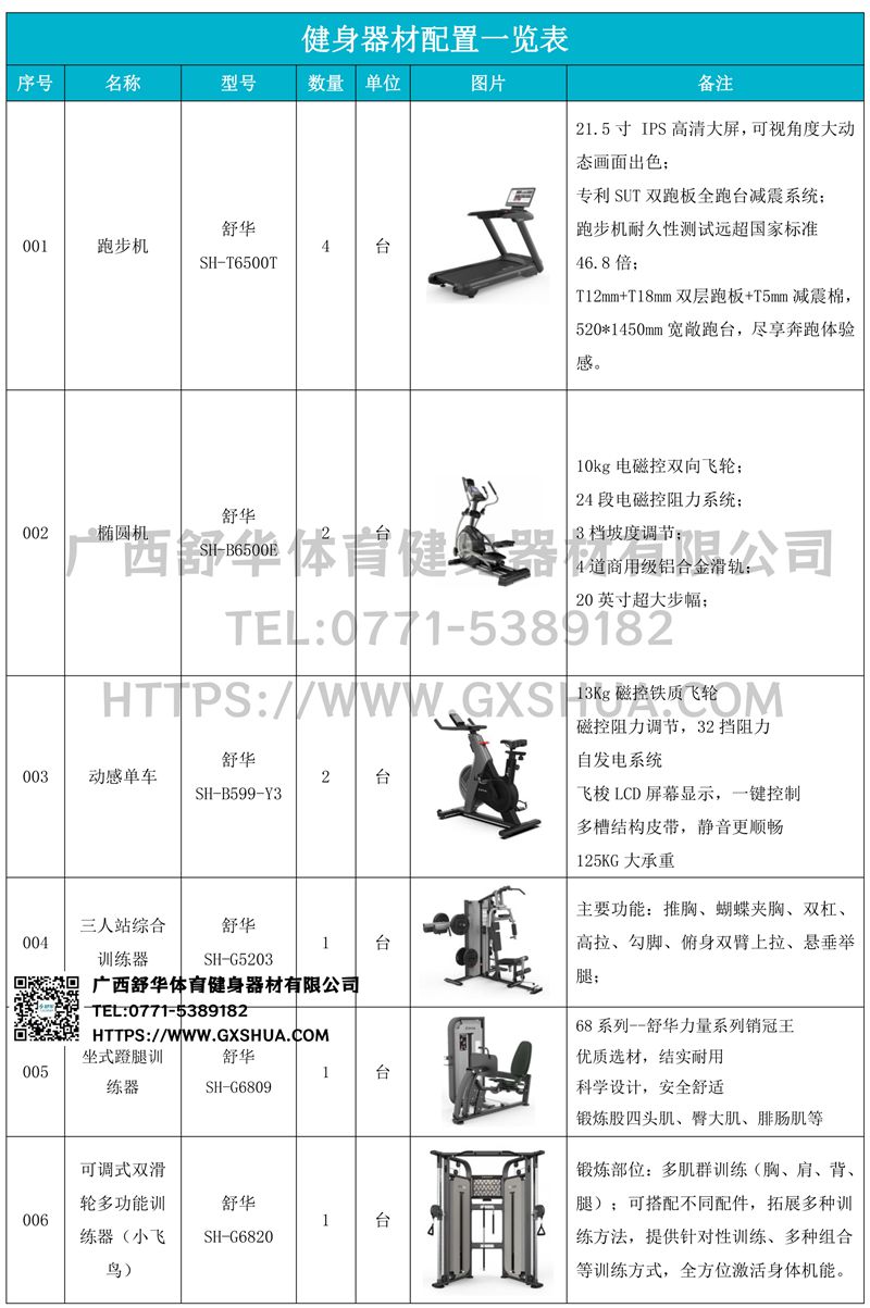 1.银河GalaxyX5 Pro跑步机SH-T6500T*4台-经典时尚造型配色,简约Z字车架造型,融合各种家居风格,彰显奢华运动质感;21.5英寸高清触控屏-传承动感美学,成就时代典型之作全新升级V3.0系统,支持系统在线升级,极大提升用户交互体验;专利减震跑台-采用SUT双层跑板、全跑台减震系统,且该减震科技获得国家专利,有效减少关节冲击,52cm宽跑台搭配精抽雏形滚筒,稳固不位移;F级马达动力强劲-5.0HP峰值马达,2.5HP持续输出,0~15%坡度调节,最高18km/h时速,胜任不同类型训练;