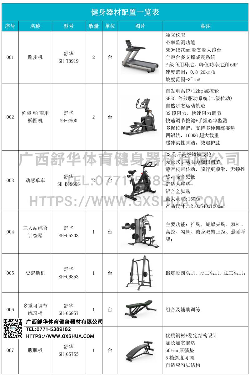 1.银河GalaxyV9跑步机SH-T8919*2台-独立仪表-简洁大气,全新外观设计,健康运动新选择;心率监测功能,可通过手握心率、无线心率带等不同方式实时采集心率数据;580*1570mm超宽超大跑台-跑感舒适,跑台整体安全稳定;全跑台多支撑减震平台,保证跑台超强支撑力,达到180kg支撑,满足健身房需求。